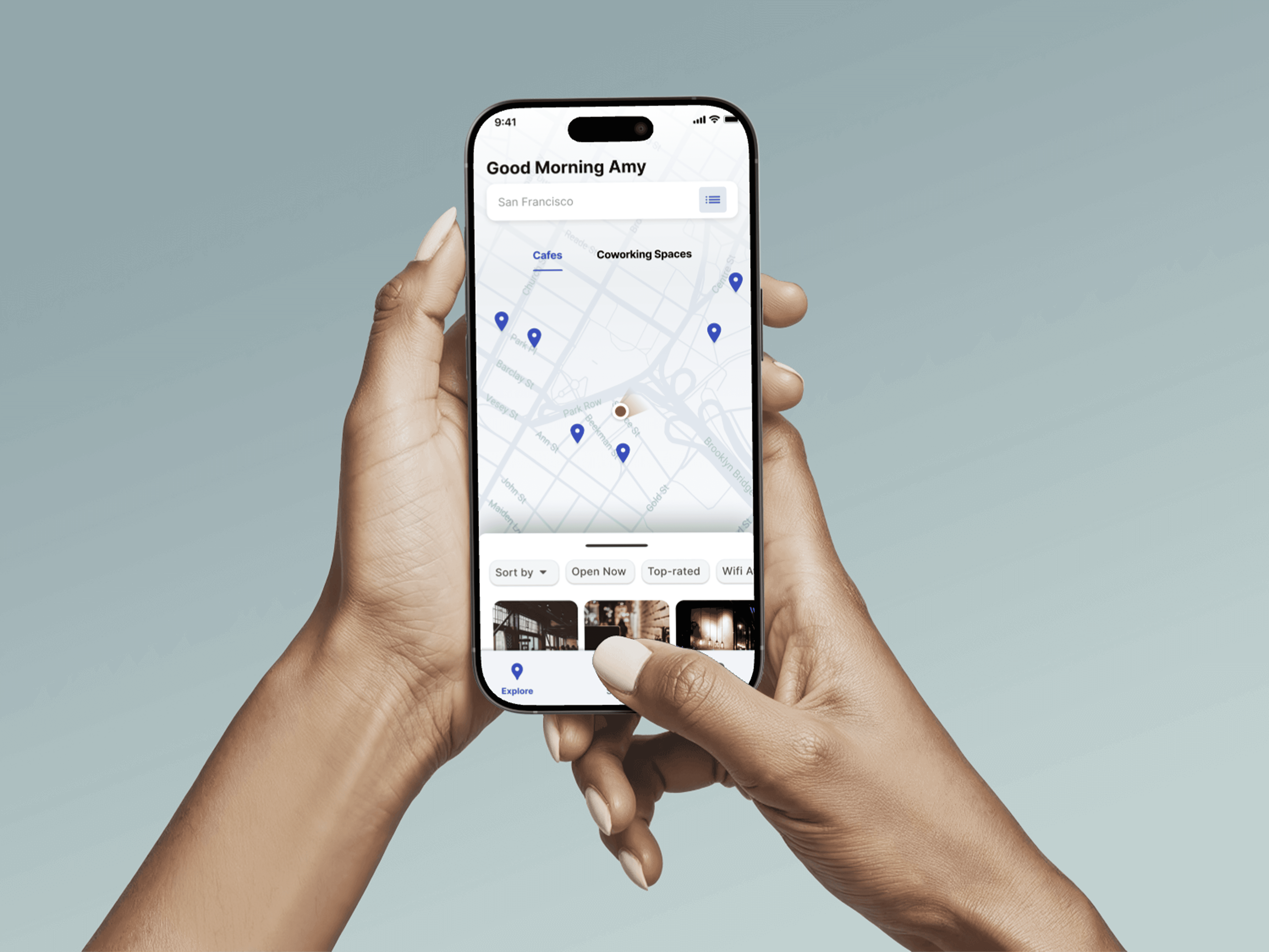 map-based exploration with café and coworking toggles